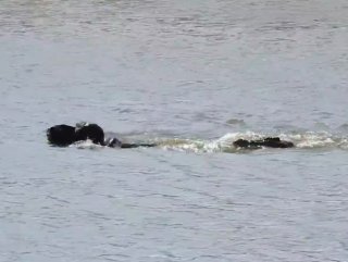 Bölgede bulunan arazide koşmaya başlayan ve önüne çıkan gölete giren bufalonun karşısına, bu kez timsah çıktı.