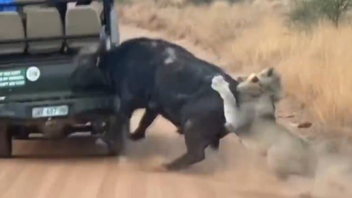 Vahşi yaşam turu atanların kamerasına yansıyan görüntülerde, can havliyle kaçan bufalo aslandan kurtulmak için uzun süre mücadele verdi.