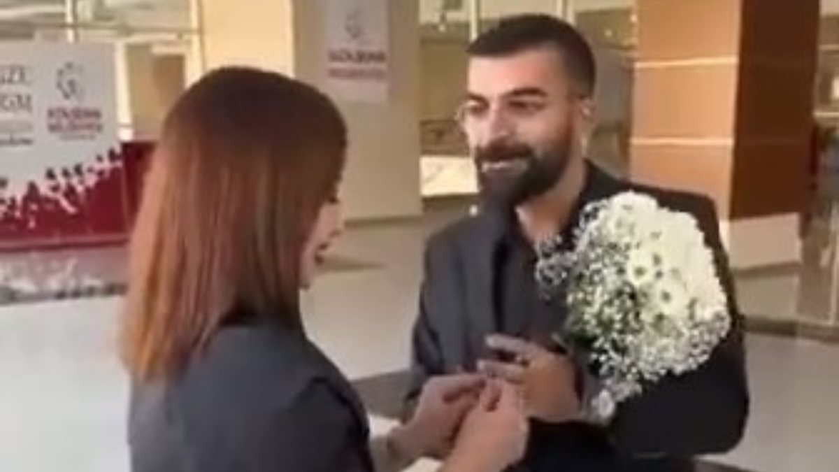 Çiçeği alınca şaşkınlık yaşayan erkeğin yanında bulunan kadın da o anda yüzüğü çıkararak erkeğe evlilik teklif etti.