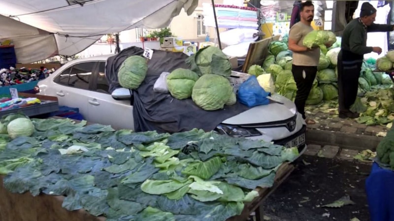 Semt pazarının kurulduğu sokağa park edilen otomobilin sahibine ulaşamayan pazarcı esnafı, bez serdiği otomobili tezgah olarak kullandı. Otomobilin üzerindeki lahanaları gören sürücü ise şaşkınlık yaşadı.