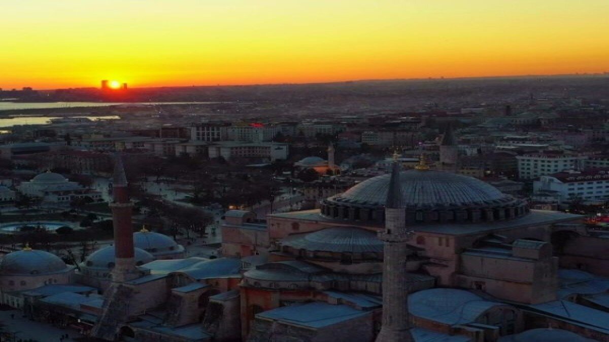 Drone ile çekilen görüntülerde gün batımıyla kızıla bürünen gökyüzü, Ayasofya’ya manzarasına eşsiz güzellik katıyor. Mavi, sarı, ve kızıl renklerinin birbiriyle müthiş uyumu havadan çekilen görüntülerde gözler önüne seriliyor.