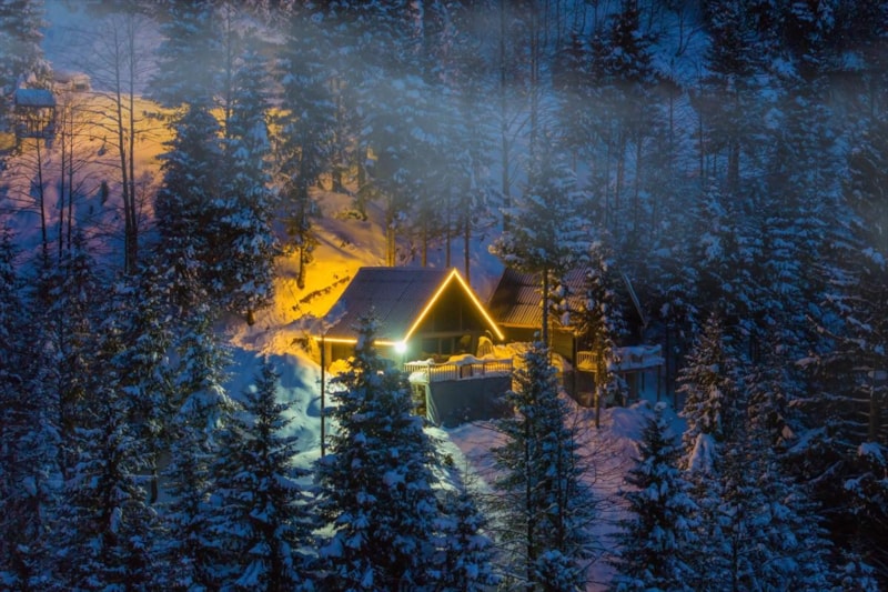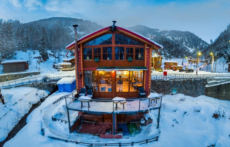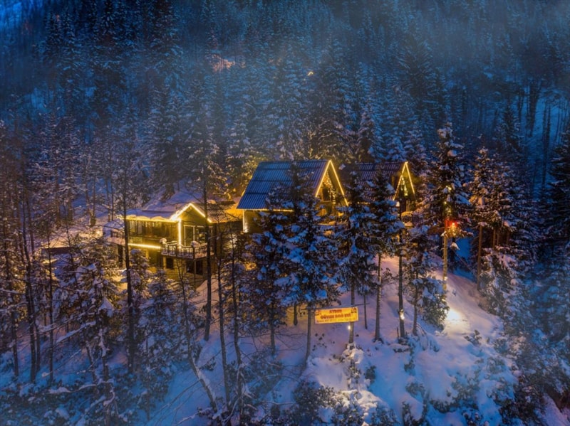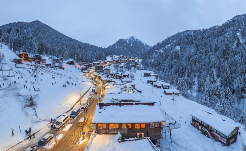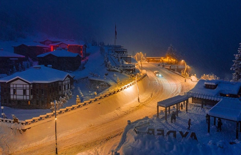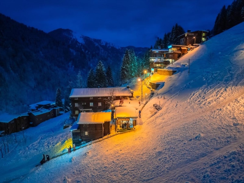 Kar yağışı ile beyaza bürünen Rize'nin Çamlıhemşin ilçesine bağlı Ayder Yaylası, akşam saatlerinde verdiği görüntü ile görenleri kendisine hayran bıraktı.