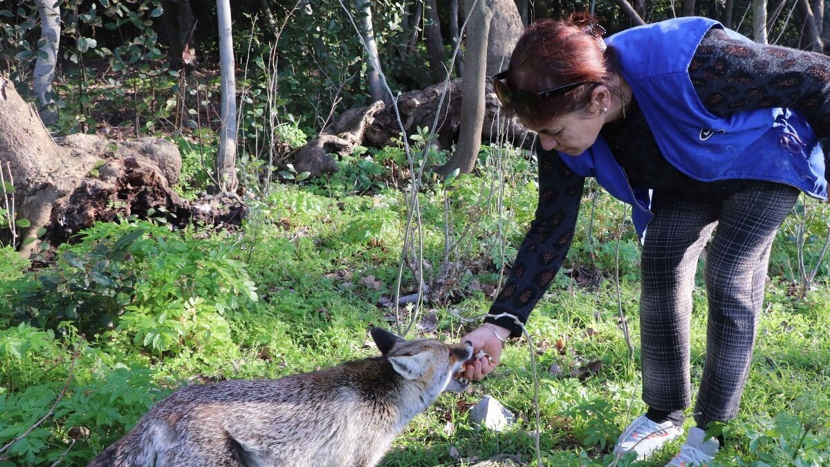 Aydın'ın Kuşadası ilçesinde yaşayan Figen Türker, Dilek Yarımadası Büyük Menderes Deltası Milli Parkı'nda karşılaştığı tilkiyi eliyle besledi.