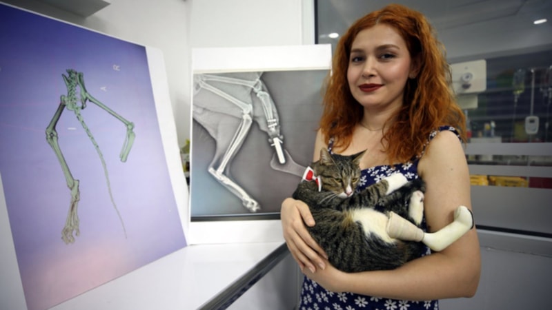 Veteriner hekim Burak Antakyalıoğlu'nun kliniğine götürülen kedinin bir ayağının kopması sonucu ciddi yaralar aldığı belirlendi. Kan kaybı yaşayan kedi tedavi edilirken, eksik ayağının yerine protez yapılması için çalışmalar başlatıldı.