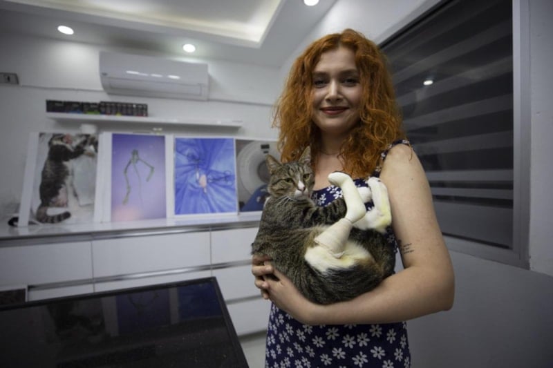 sahipsiz köpeklerin saldırısı sonucu bir ayağını kaybeden kediye üç boyutlu yazıcıyla üretilen protez ayak takıldı.