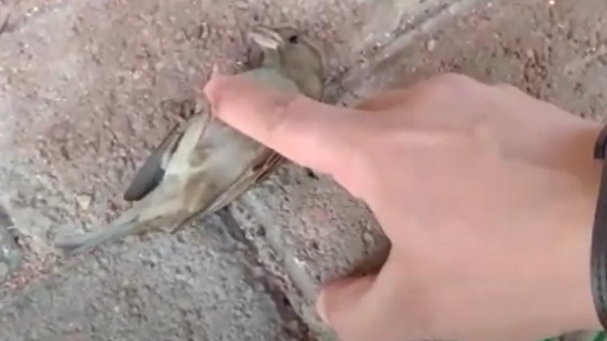 Yerde hareketsiz yatan serçeyi gören Sivrioğlu, parmağıyla kalp mesajı yaparak hayata döndürdü.