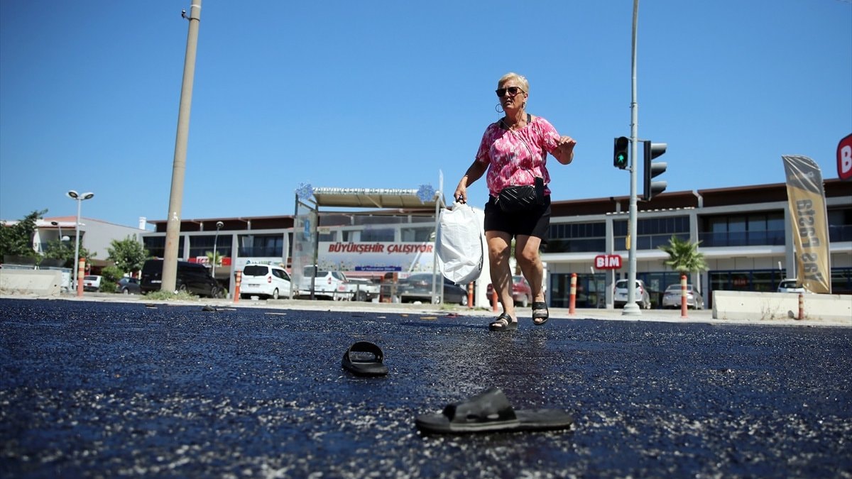 Kuşadası'nda Davutlar yolunda asfalt eridi. Eriyen asfalttan yolun karşısına geçmek isteyen vatandaşlar, zor anlar yaşadı.