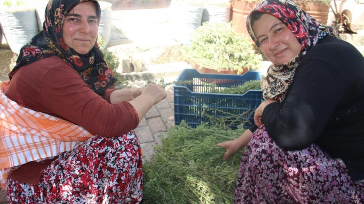 Çarıklar köyü sakinlerinden Kadriye Bulut ve Saime Doğan önderliğinde bir araya gelen kadınlar, dağlarda kendiliğinden doğal ortamında yetişen kekikleri toplayıp suyunu çıkarıyor.