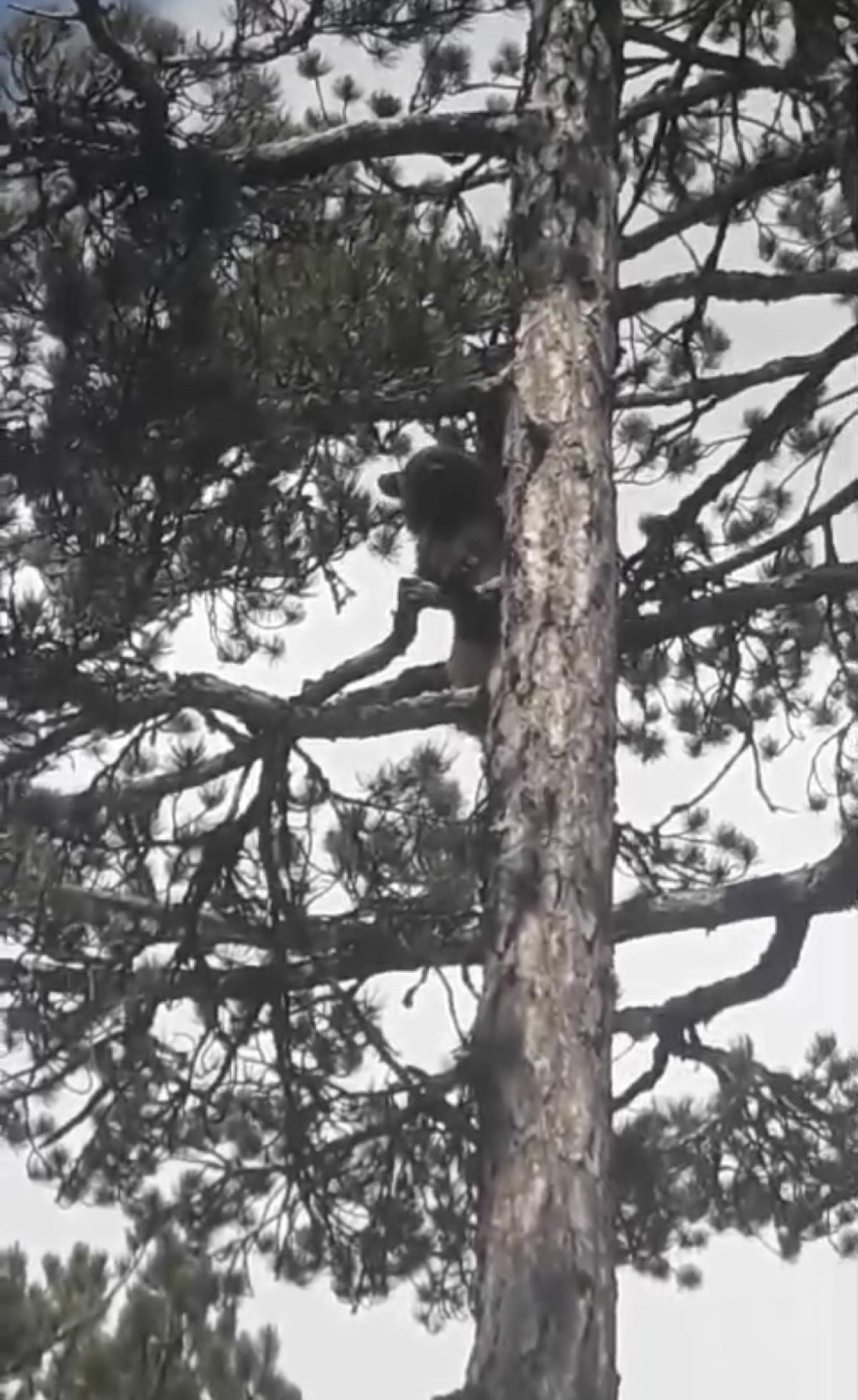Motosikletini durduran Güneş, cep telefonuyla kendisinden korkarak kaçan bozayının çam ağacına çıkışını görüntüledi.