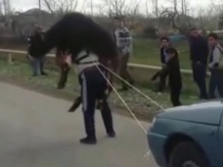 Azerbaycanlı pehlivandan danalı araçlı güç gösterisi