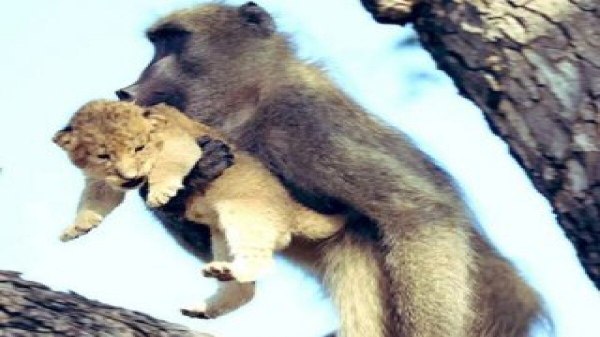 Güney Afrika Kruger Ulusal Parkı'ında bir babunun aslan yavrusunu kurtarıp ağaca çıkarması, ünlü Disney filmi Alsan Kral'daki Rafiki ile Simba arasında ilişkiyi akıllara getirdi.