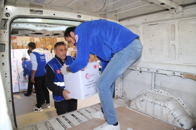 Burada araçlara yüklenen yardım kolileri, ihtiyaç sahiplerinin evlerine götürülerek teslim edildi.
