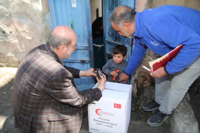 Yardım kolilerin dağıtımına BAE Ankara Büyükelçiliği görevlisi Muhammed Öztürk ve gönüllüler katıldı.