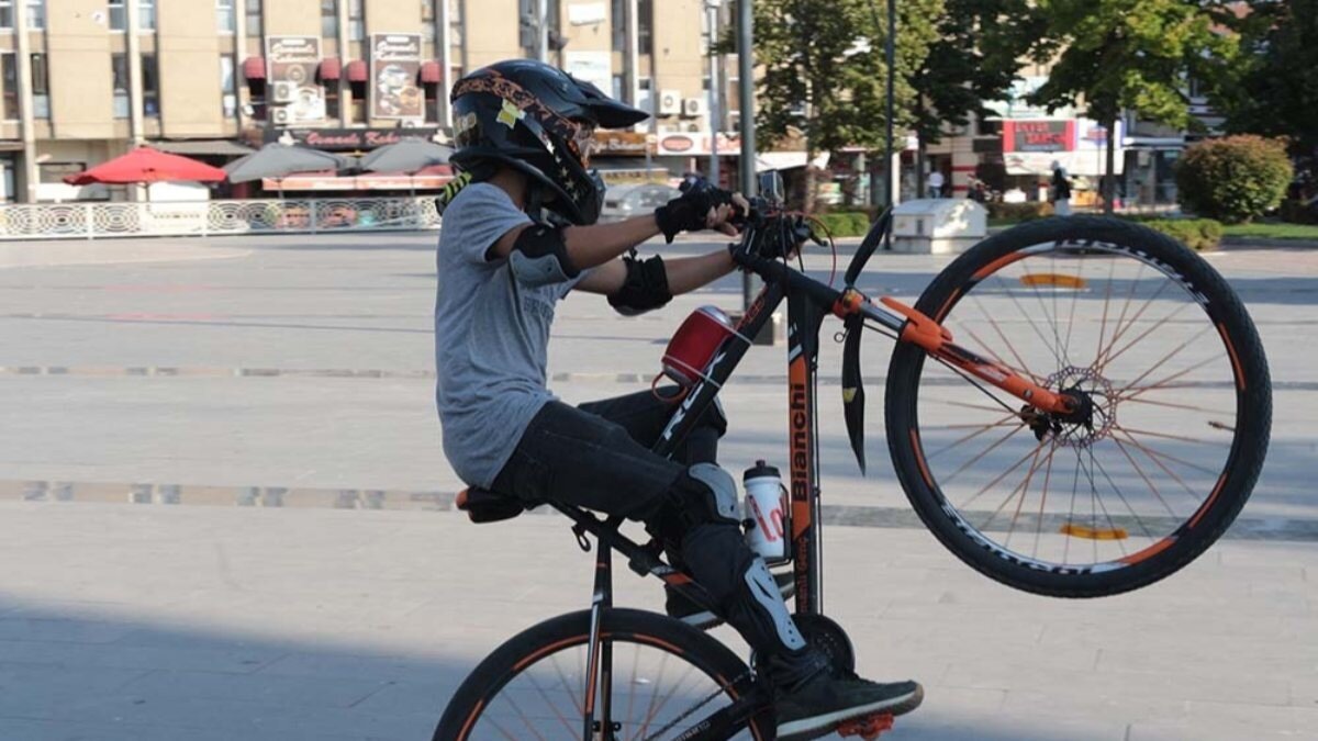Bisikletle tek tekerlek üzerinde 4 kilometre düşmeden yol yaptığını söyleyen Enes Göktaş, trafiğe kapalı alanda çektiği video ile de sosyal paylaşım sitelerinde izlenme rekoru kırıyor.