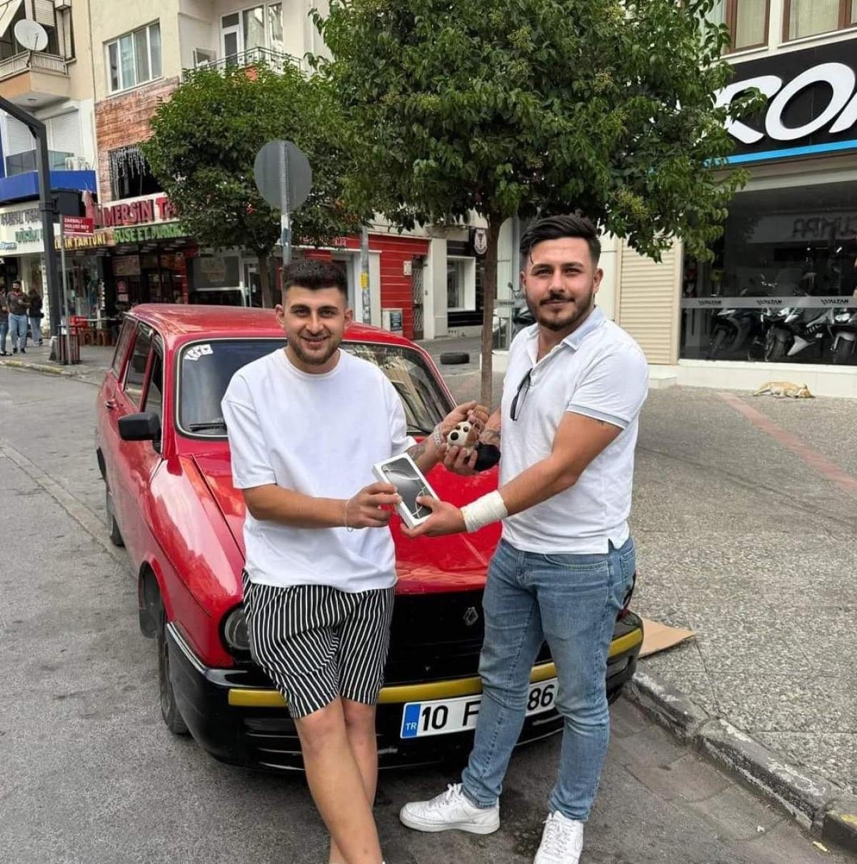 Fotoğrafta, araç sahibi ve telefon sahibi bir araya gelerek el sıkışırken, ellerindeki telefon ve aracın anahtarını gösterdikleri anlar kameralara yansıdı.