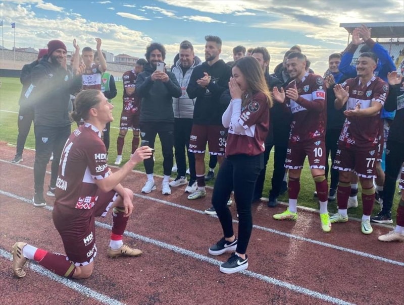Spor Toto 1. Lig'in 21. haftasında Tuzlaspor'u mağlup eden Bandırmaspor'da futbolculardan Mehmet Özcan, maçın ardından sahada kız arkadaşına evlilik teklifinde bulundu.