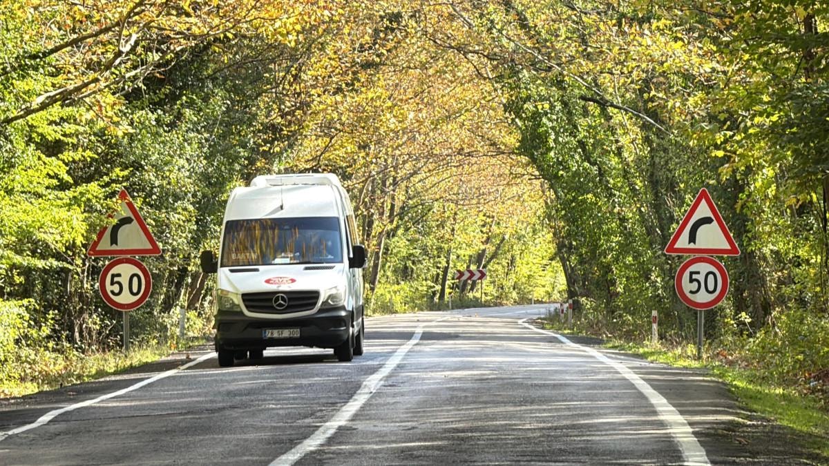 Bartın-Karabük yolundaki ağaçlı yol, yeşilin ve sarının pek çok tonunu barındırmasıyla, her mevsim ayrı renk cümbüşüne bürünüyor.