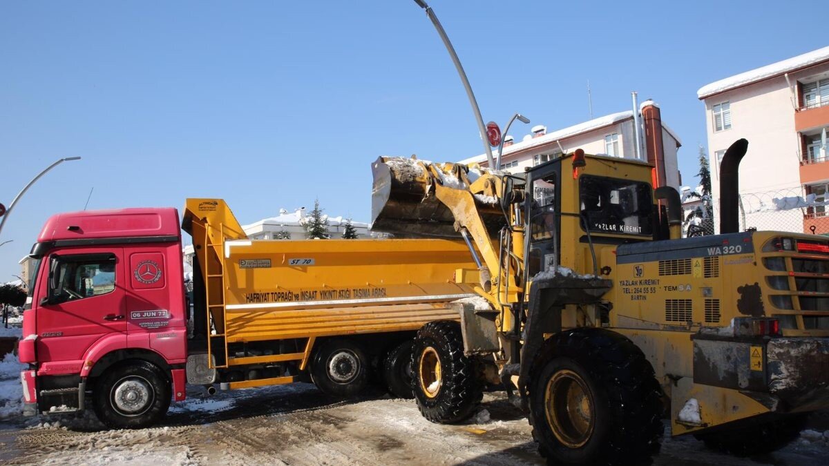 Ara sokaklardaki karlar önce küçük kepçelerle belirli noktalarda toplanıyor. Ardından da kamyonlara yüklenerek Bartın Irmağı'na boşaltılıyor.