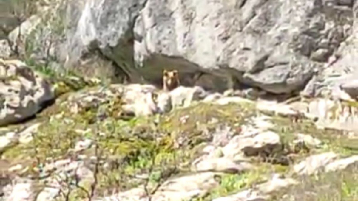 Bir süre şelaleyi izleyen iki arkadaş, ardından üst taraftan gelen ses üzerine gidip, baktıklarında mağaradan kış uykusundan kalkan bir ayının kendilerine baktığını gördü.