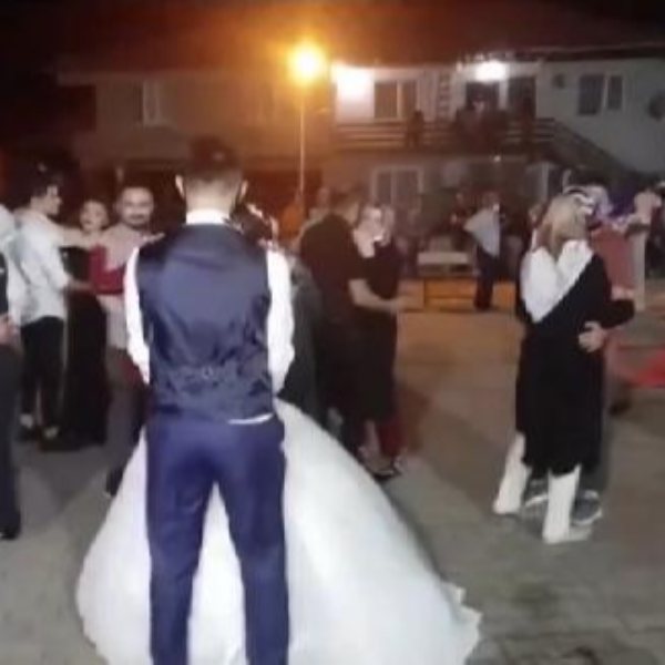 Düğünde, sosyal mesafe kuralı hiçe sayıldı. Gelin ile damadın dışındakilerin de dans ettiği ve oyun havalarıyla yakın mesafede oynadığı görüldü.