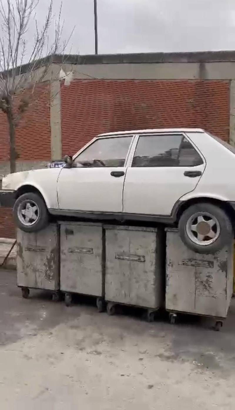 Sanayi mahallesinde bulunan çöp konteynerinin üzerine yerleştirilen araç vatandaşlarda şaşkınlık yaratırken yaşanan anlar kameraya yansıdı.
