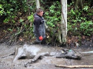 Kaçan mandaları yakalamak için çalışan Kılıçarslan, mandalardan birini Bolu Dağı Bakım İşletme Merkezinin bahçesinden geçen dere yatağında bataklığın içerisine saplanmış şekilde buldu.