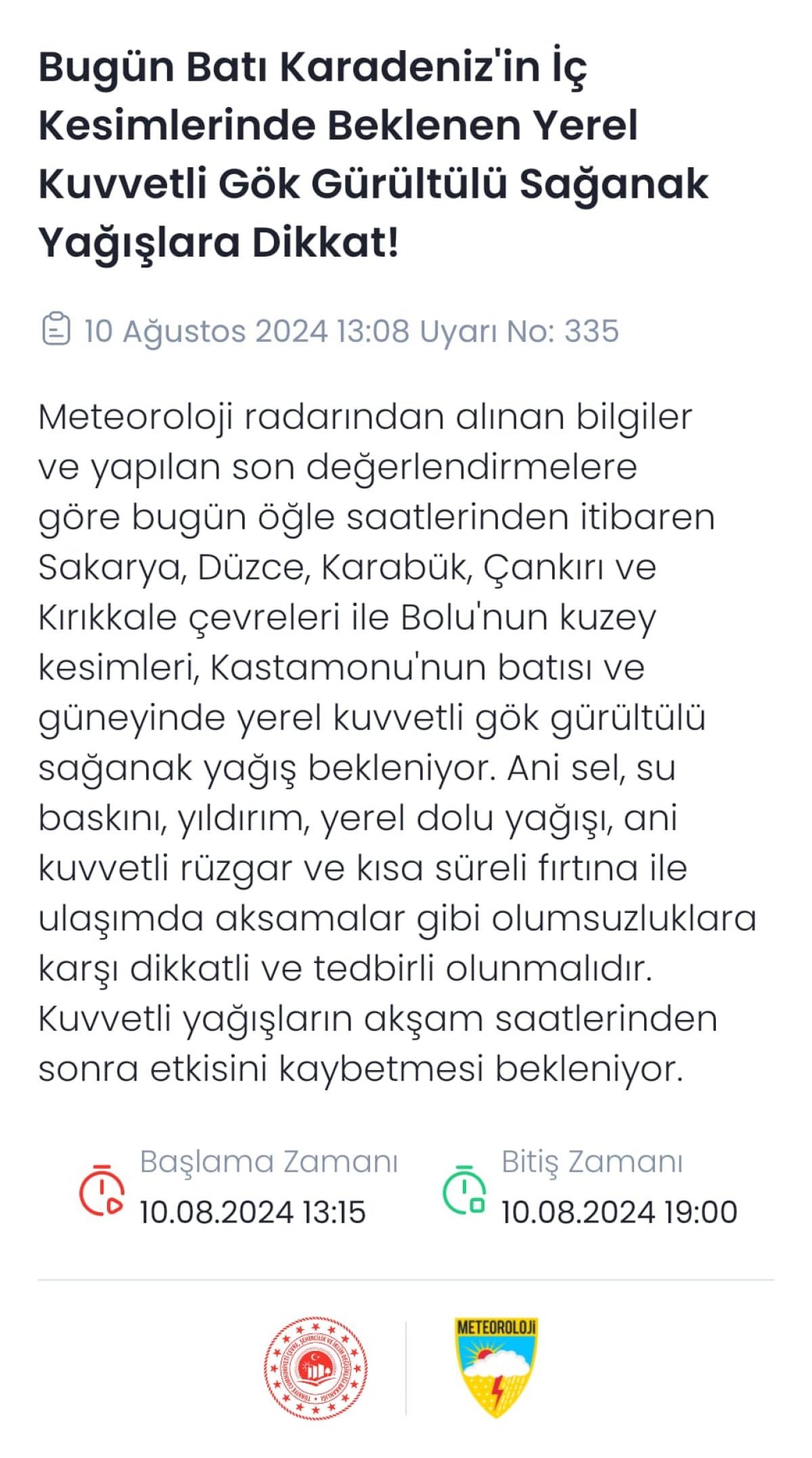 Söz konusu açıklamada yağış alacak bölgeler ise Sakarya, Düzce, Karabük, Çankırı ve Kırıkkale çevreleri ile Bolu'nun kuzey kesimleri, Kastamonu'nun batısı ve güneyi olarak belirlendi.
