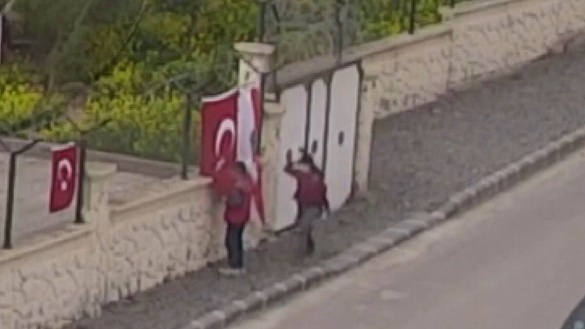 İlçe Emniyet Müdürlüğü duvarında asılı halde bulunan Türk bayrağını gören iki çocuk öperek yoluna devam etti.