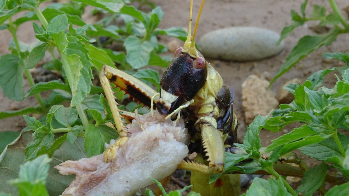 Bağ ve bahçe işlerinde çalışan çiftçilerden Tahsin Kaya ise "Her gün biz bahçe işlerinde çalışmak için buraya gelip gündelik işlerimizi yapıyoruz. Burada nane domates biber sulamasını yaparken böyle arada sırada çapa yaparken baktık dev bir çekirge gördük televizyonlarda ve internette bunların etçil olduğunu az çok biliyorduk. Biz zannediyorduk ki bu dev çekirgeler yeşillikle besleniyor. Ama televizyon ve internetten bunların etçil olduğunu öğrenince biz de merak oldu. Bizde burada mangal yakmıştık ve eti verelim arkadaşımla birlikte bakalım yiyecek mi dedik ve eti verdik baktık eti yedi şaşırdık kaldık" diye konuştu.