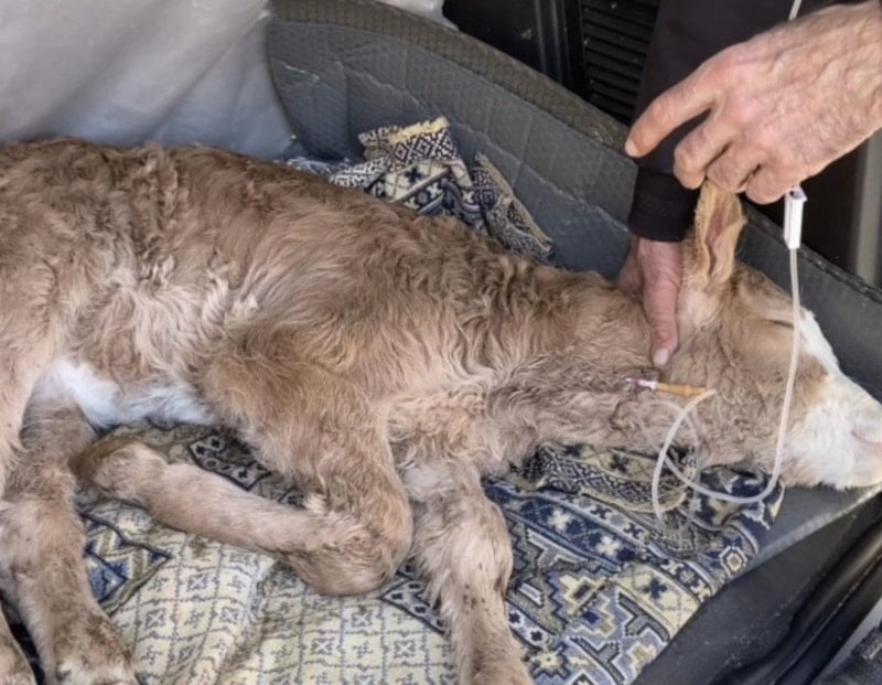 Buzağıya aracın bagajında ilk müdahaleyi yapan veteriner hekim İhsan Şahin, hayvanın ishale bağlı su kaybı nedeniyle güçsüz düştüğünü belirleyip serum taktı.