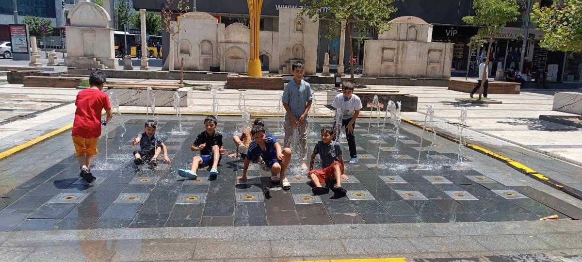 Aynı noktada bulunan süs havuzunda ise çocuklar serinlemek için kendilerini suya bıraktı.