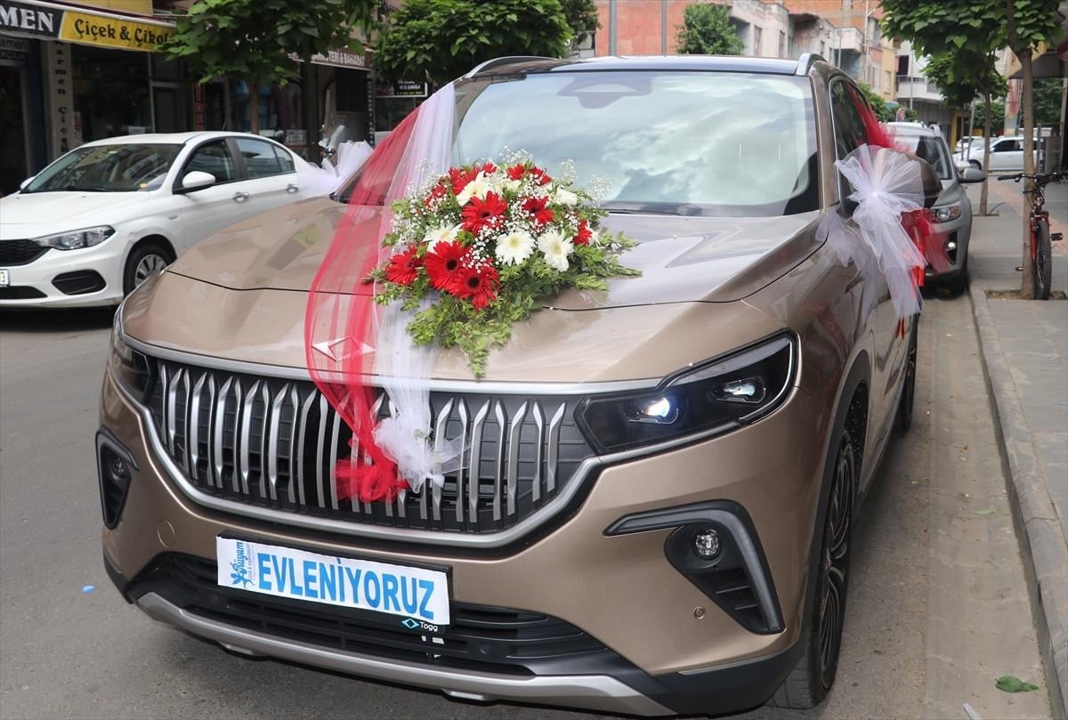 Talepleri kabul edilen çift için tahsis edilen Togg aracı süslendi.