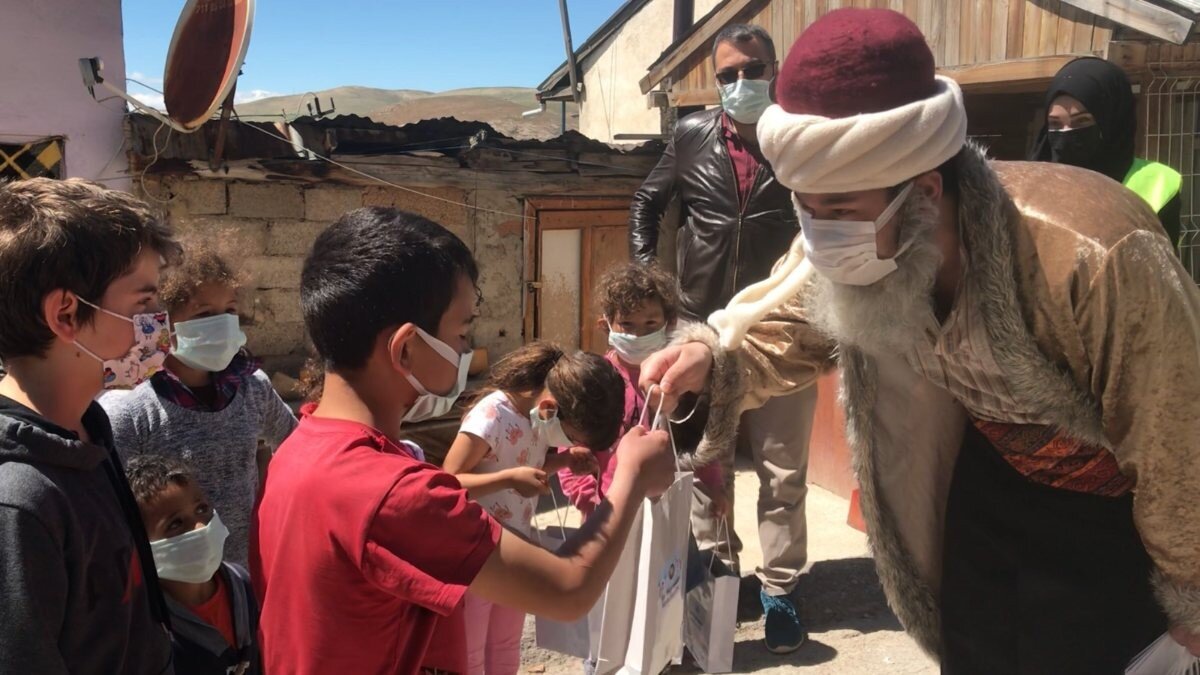 Bayburt'un Masat köyünde de türbesi bulunan Dede Korkut karakterini canlandıran üniversite öğrencisi Samet Erdaş, sokak sokak dolaşarak çocuklara şeker ve bayram harçlığı dağıttı.