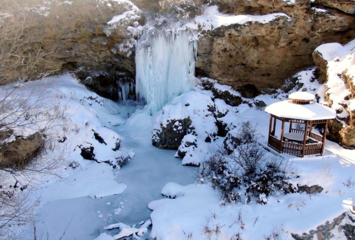 Divanyolu Dağları ile Kırklar Tepe eteklerinden doğduktan sonra Kopuz Deresi'nden yaklaşık 20 metreden dökülen Sırakayalar Şelalesi de buz tuttu.