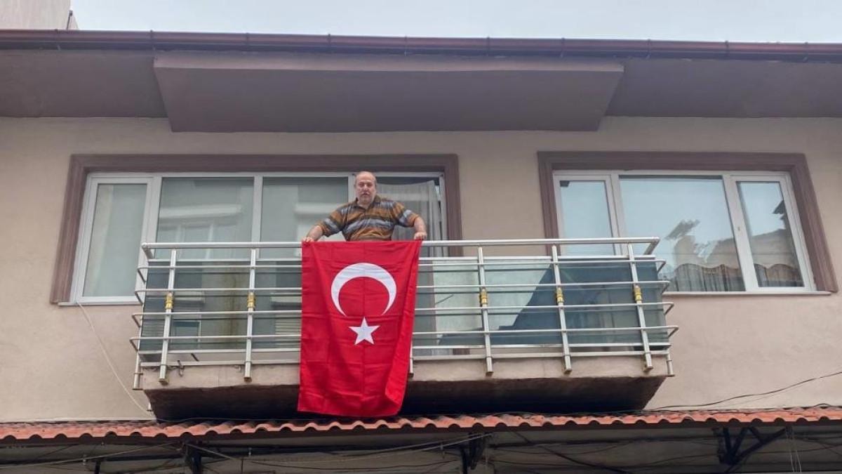 Türkiye'nin bayrak dayısı olarak tanınan Tahtalıoğlu bu kez Dursunbey Belediyesi tarafından kendisine hediye edilen Türk Bayrağını aynı balkona astı.