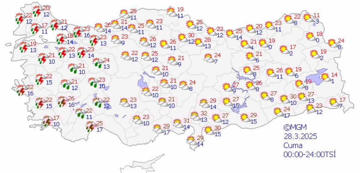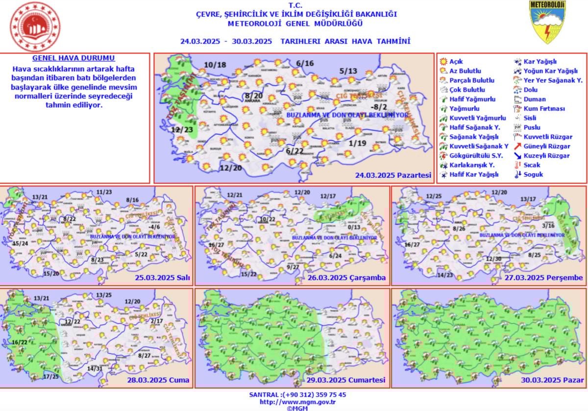 Meteoroloji'nin resmi internet sitesinde yer alan mart ayının son haftasına ilişkin hava haritasında şu bilgilere yer verildi: