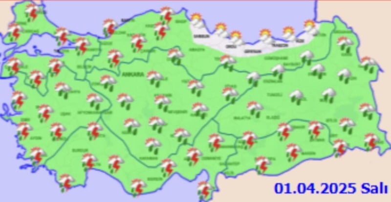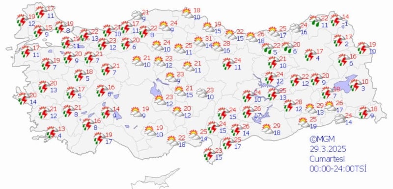 Marmara, Ege, Akdeniz ve Güneydoğu Anadolu bölgelerinde yağışların gök gürültülü sağanak şeklinde olması bekleniyor.