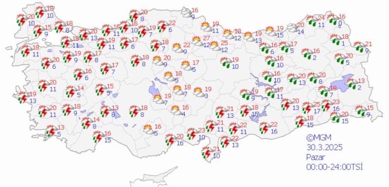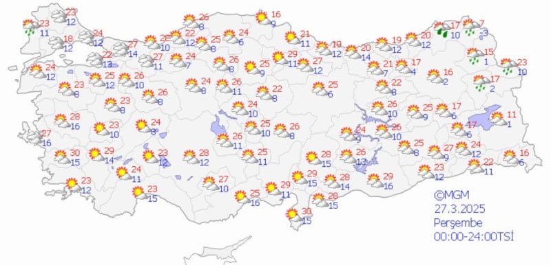İstanbul'da en düşük 8, en yüksek 18, Ankara'da en düşük 8, en yüksek 18, İzmir'de en düşük 13, en yüksek 19, Antalya'da da 16 derece civarında olması bekleniyor.