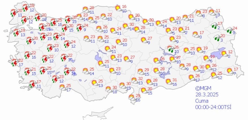 İstanbul'da en düşük 8, en yüksek 19, Ankara'da en düşük 10, en yüksek 21, İzmir'de en düşük 14, en yüksek 20, Antalya'da da 18 derece civarında olması bekleniyor.