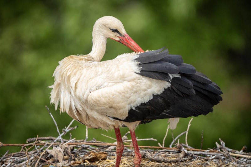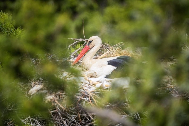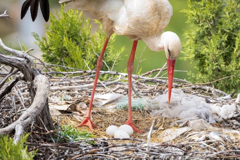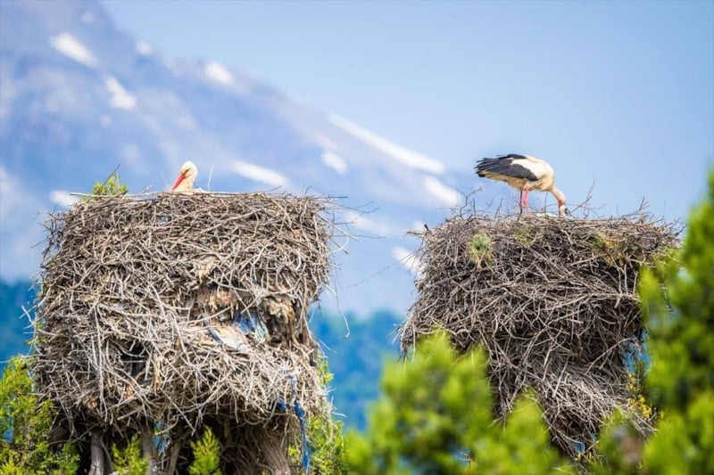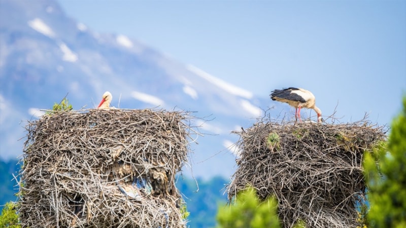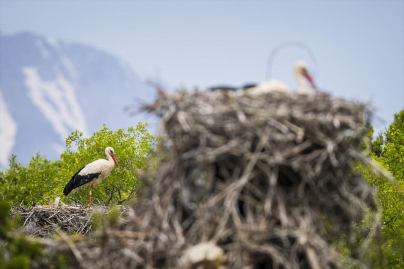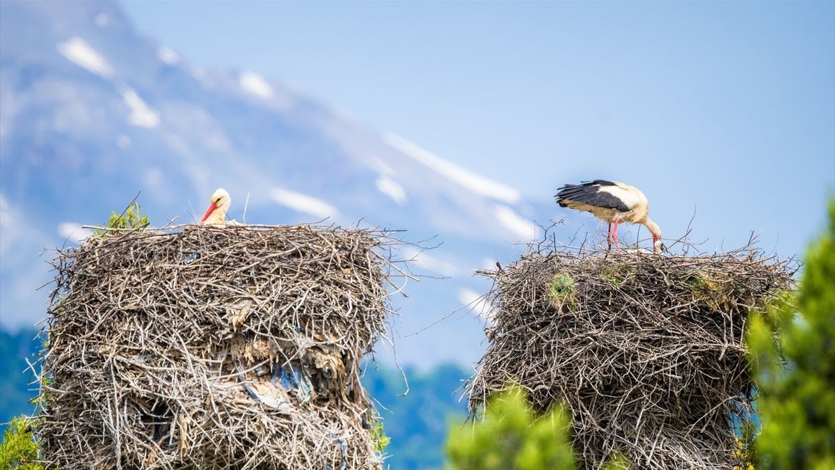 Çok sayıda leylek yuvası bulunan bölgede, her yuvanın başında ebeveyn leyleklerden biri gün boyu beklerken diğeri avlanmaya gidiyor.