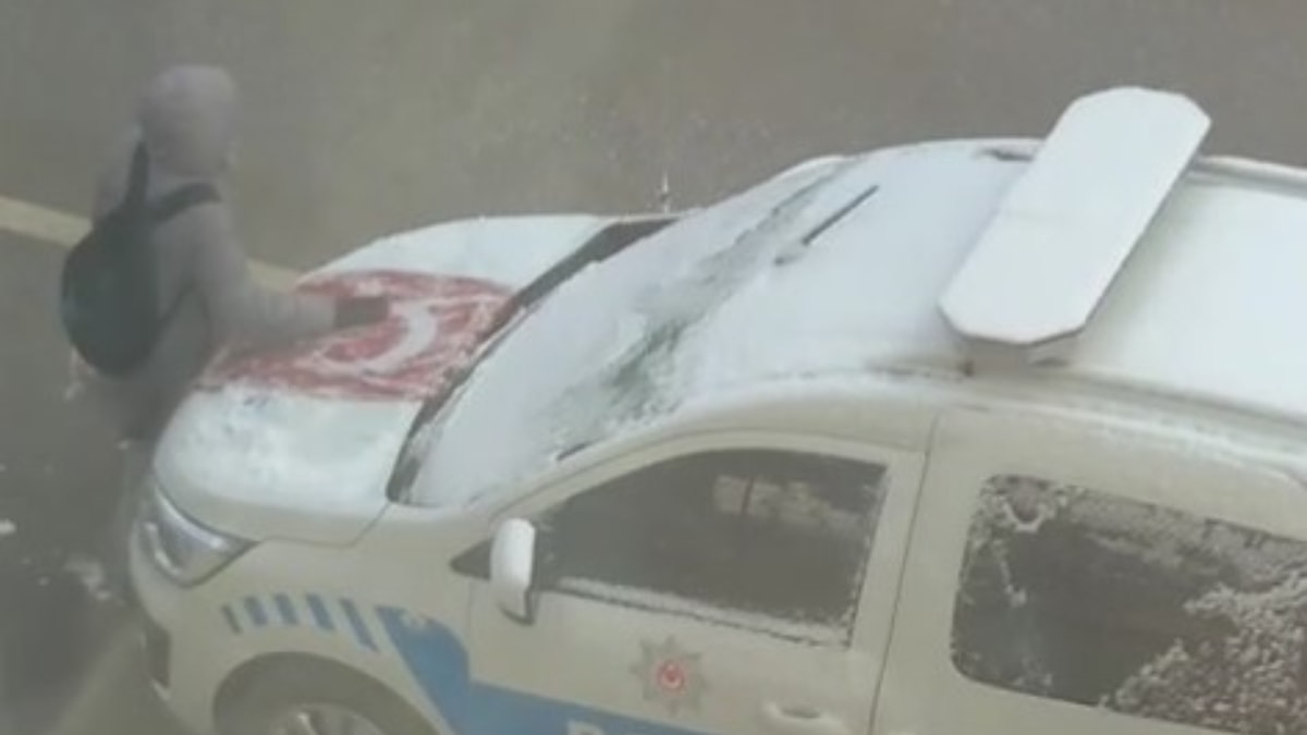 ELLERİYLE BAYRAK ÜZERİNDEKİ KARI TEMİZLEDİ