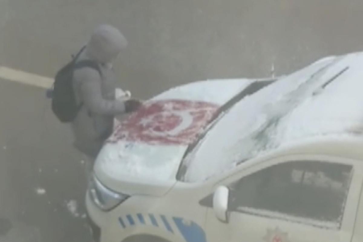 Okul çıkışı eve dönen bir çocuk Türk bayrağını karla kaplı olmasını görmesi üzerine eliyle karları temizledi.