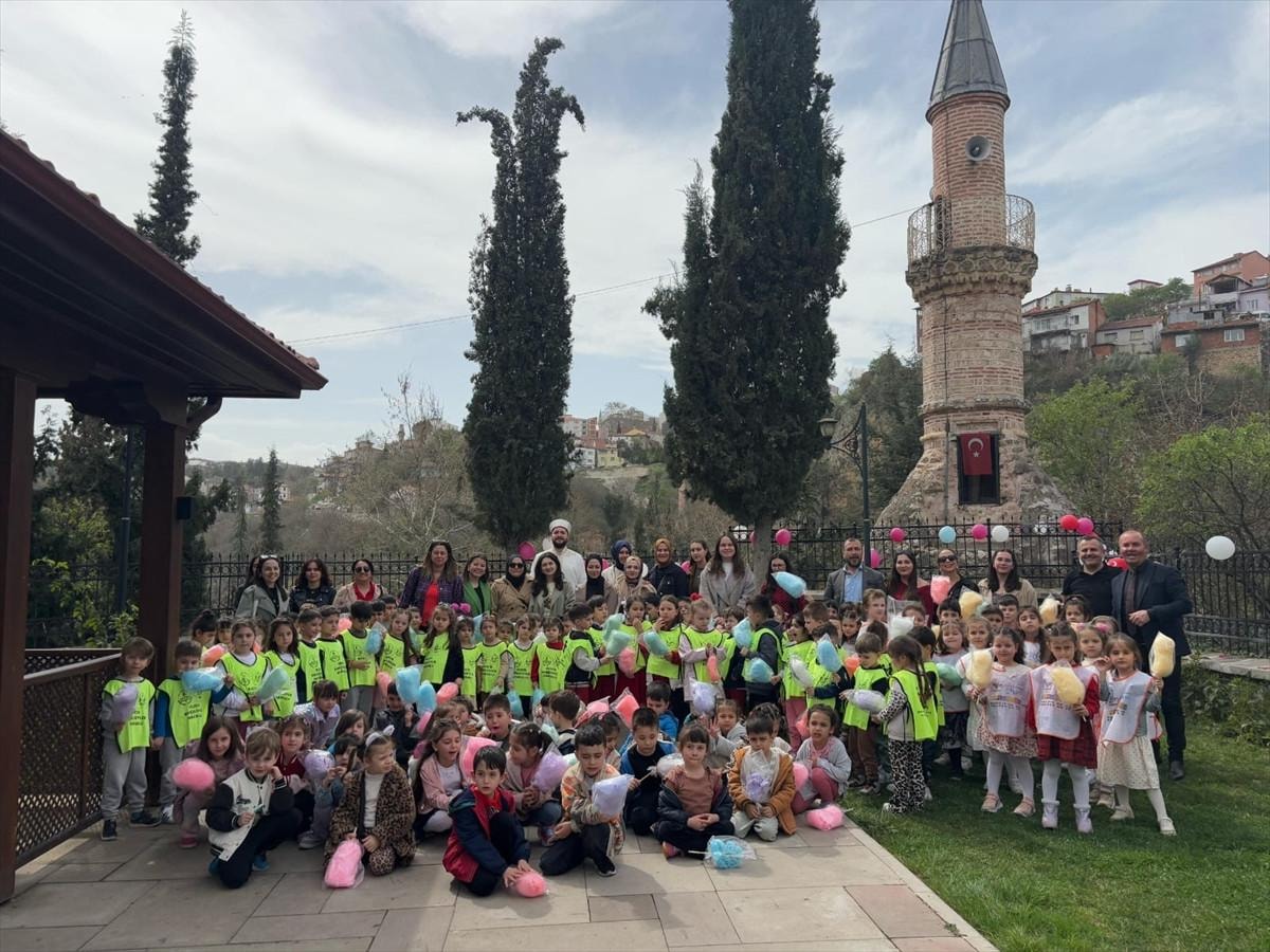 Şeyh Edebali Külliyesi'ndeki Orhan Gazi Camisi'nden, 30 metre mesafedeki kaya üzerine inşa edilen minare önünde toplanan anaokulu öğrencilerine İl Müftü Yardımcısı Sabri Bağcı'nın dualarıyla görevliler tarafından sepetle şeker dağıtıldı.