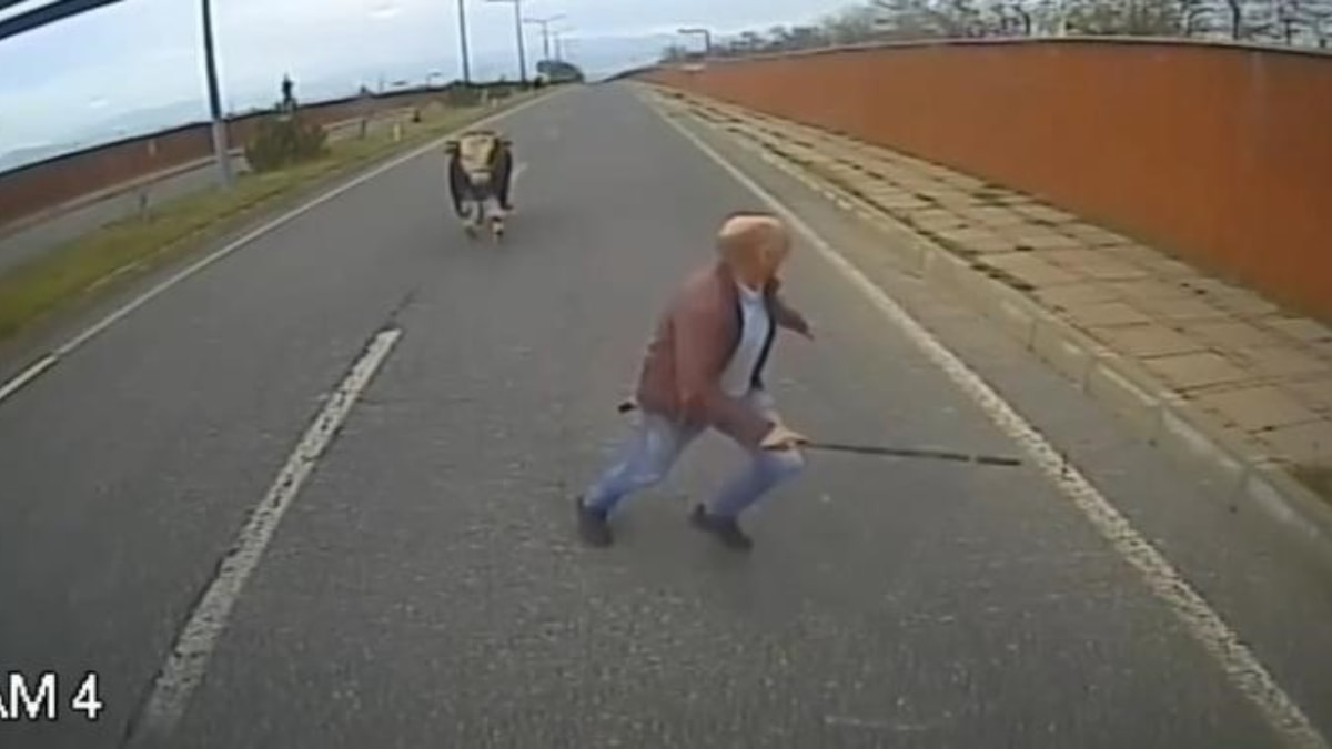 BOĞA BİR ANDA ŞOFÖRÜ KOVALAMAYA BAŞLADI