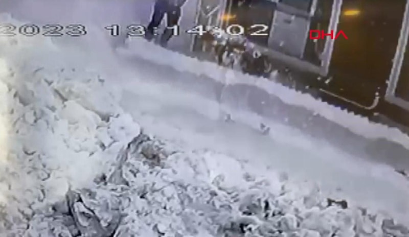 Bingöl Karlova'da kaldırımda yürüyen vatandaşın kafasına çatıdaki karların düşmesi kameralara yansıdı.