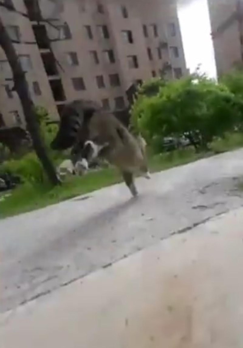 Kahramanımız, gözüne kestirdiği rakibini birkaç dakika aralıksız kovalarken, yakaladığı kediyle kavgası da kameraya yansıdı.