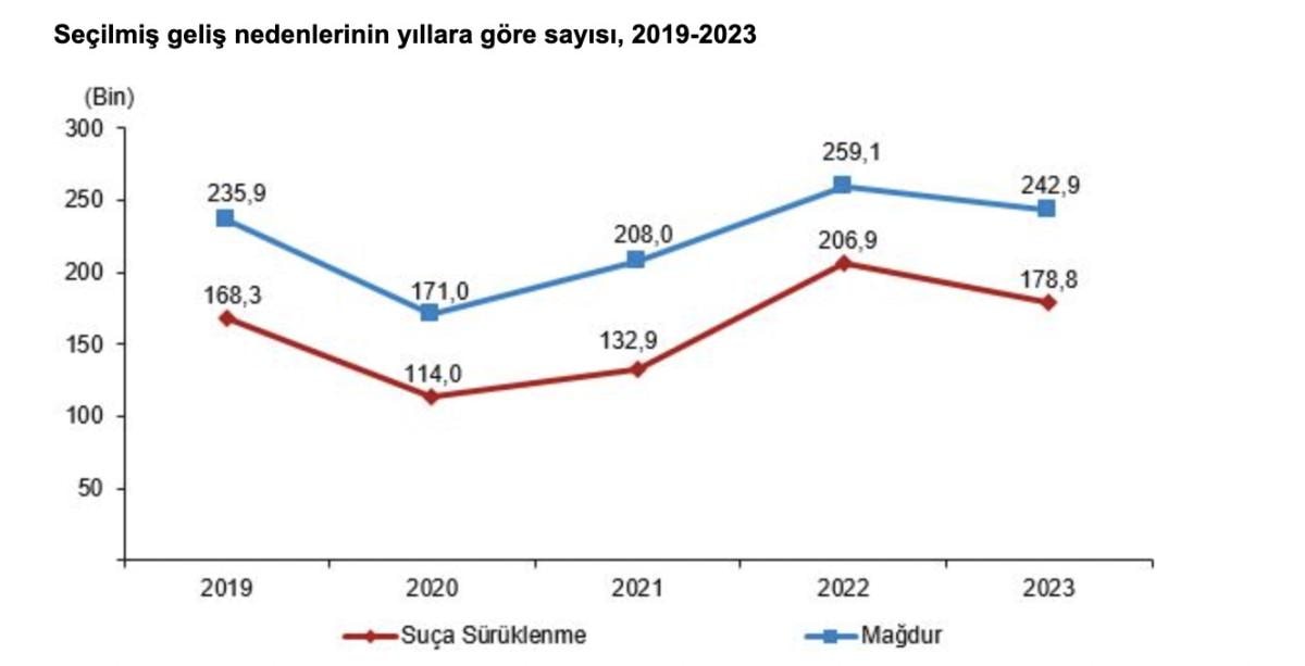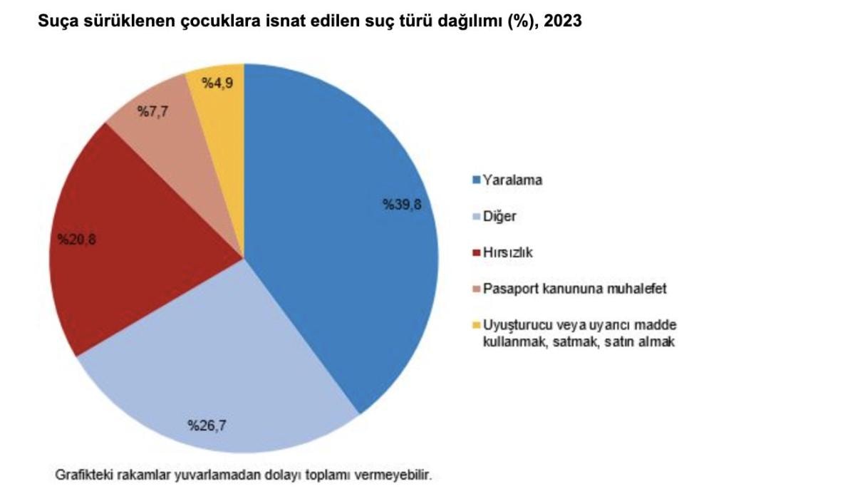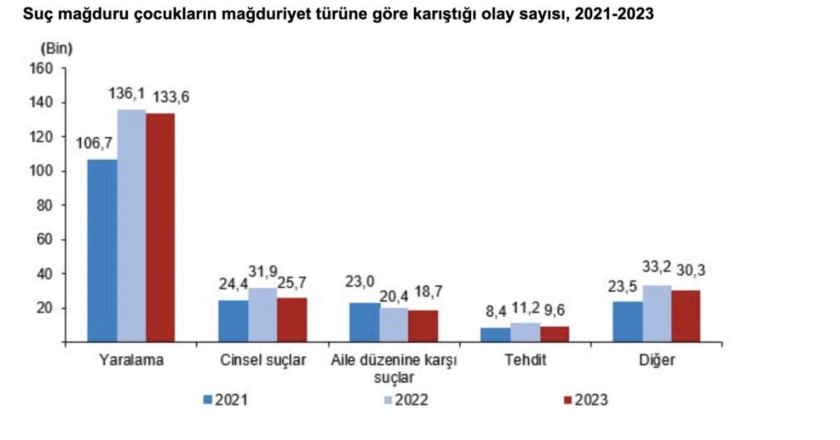 Güvenlik birimlerine suç mağduru olarak gelen veya getirilen 217 bin 915 çocuğun yüzde 61,3'ü yaralama, yüzde 11,8'i cinsel suçlar, yüzde 8,6'sı aile düzenine karşı suçlar, yüzde 4,4'ü tehdit, yüzde 13,9'u ise bu nedenlerin dışında kalan diğer nedenlerden dolayı mağdur oldu.