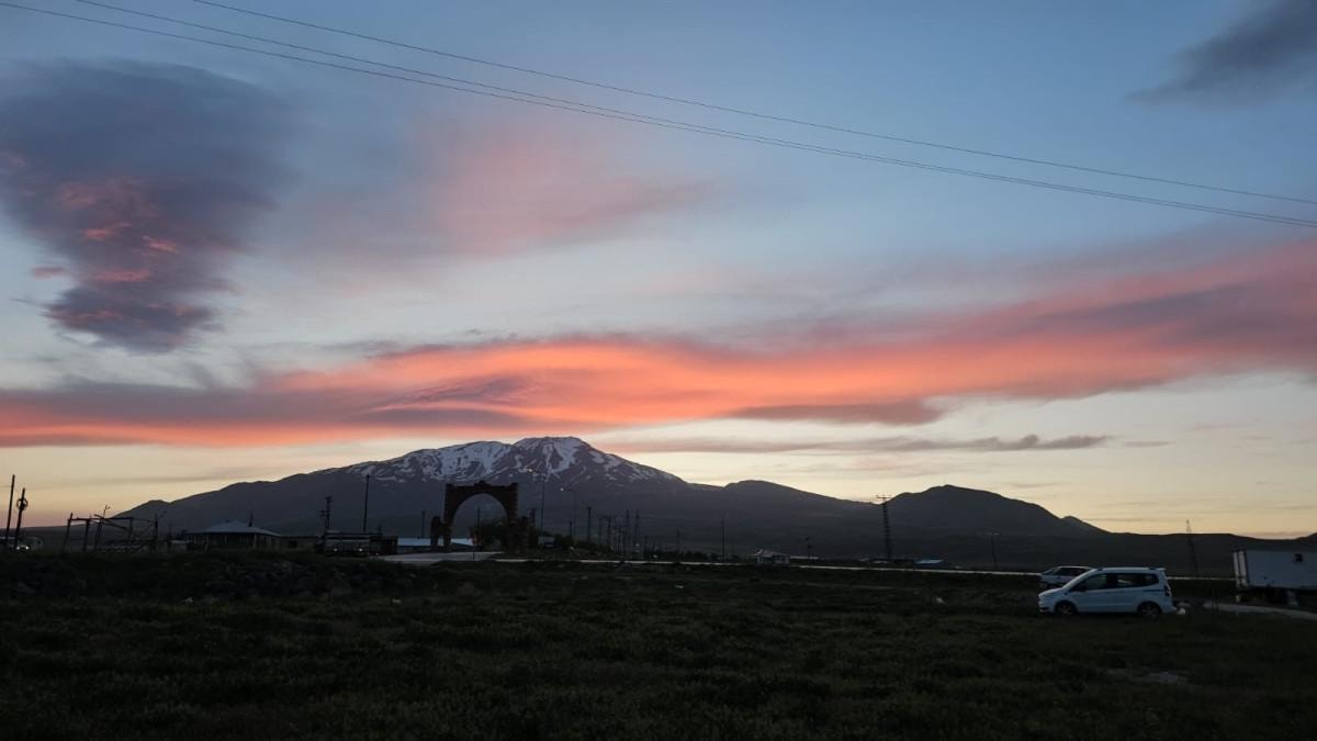 Akşam saatlerinde zirveye doğru yoğunlaşan kızıl bulutlar, dağın karlı zirvesiyle birleşerek adeta kartpostallık görüntüler oluşturdu.
