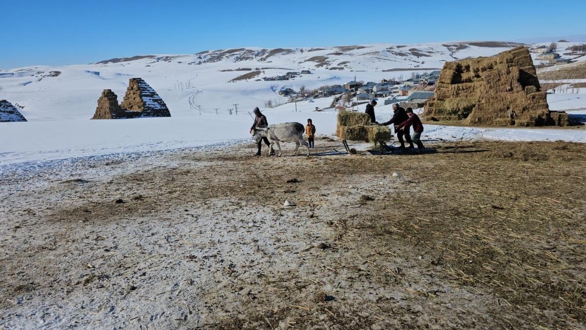 Mart ayından bu yana hayvanlarını yaylada otlatan köylüler, kar nedeniyle de 4 ay süreyle hayvanlarını karın üzerinde beslemek için mesailerini sürdürüyor.
