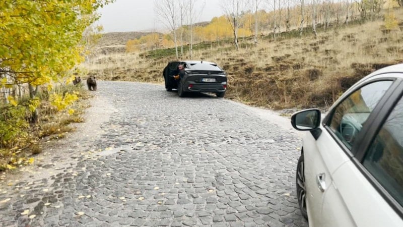 Vatandaşlar ayıları korna sesiyle uzaklaştırmaya çalışırken, o korkulu anlar cep telefonlarına da yansıdı.